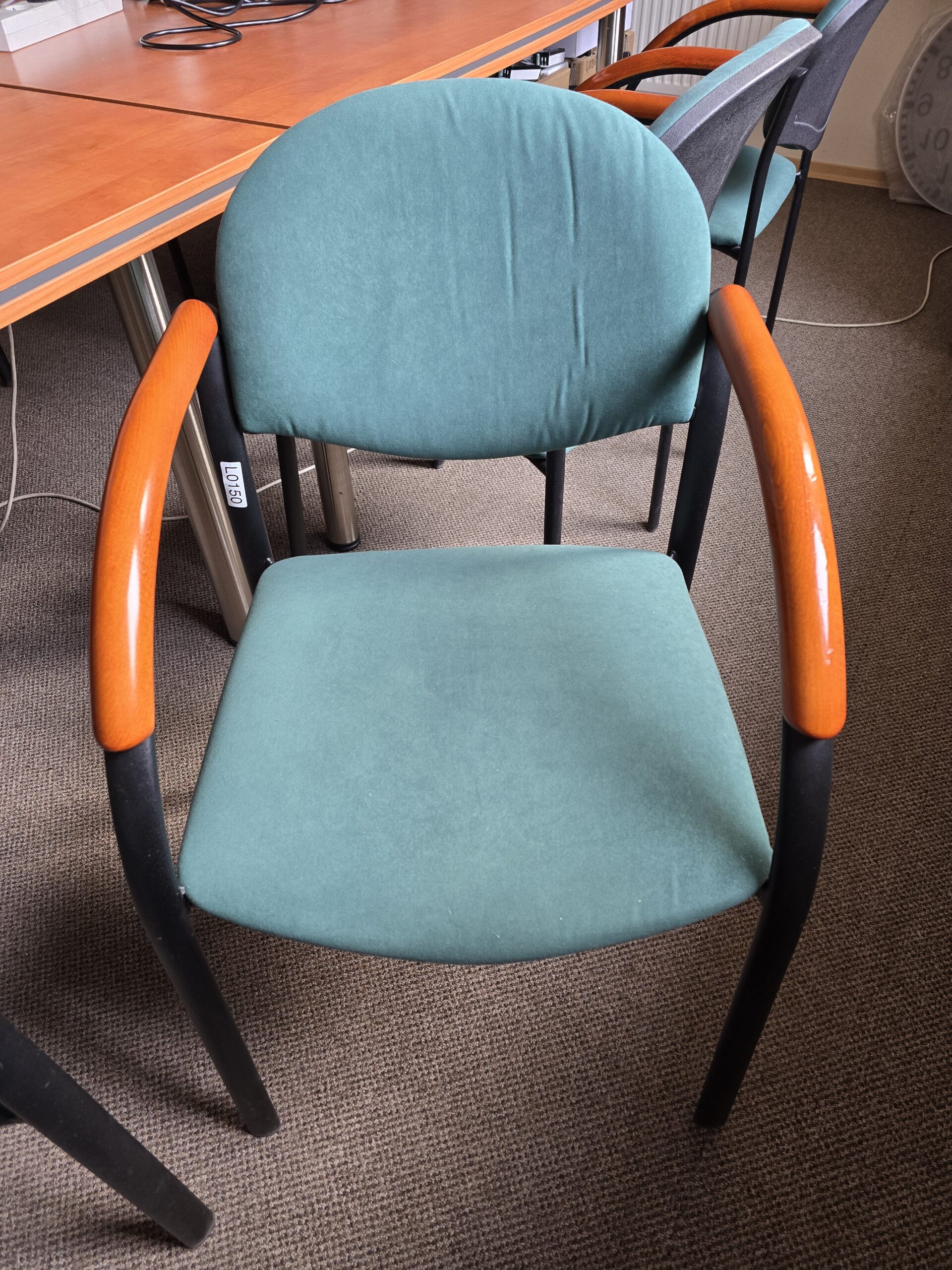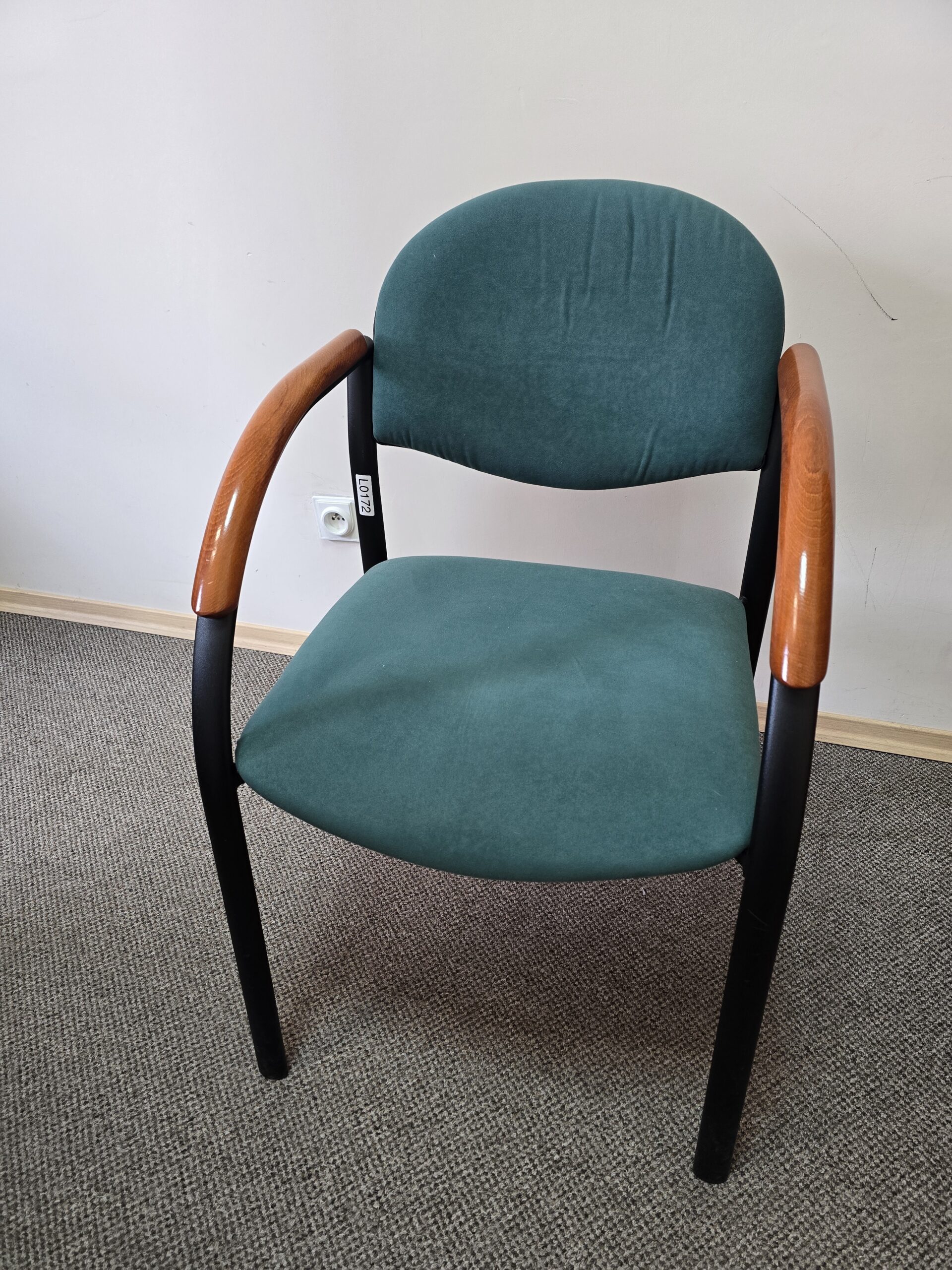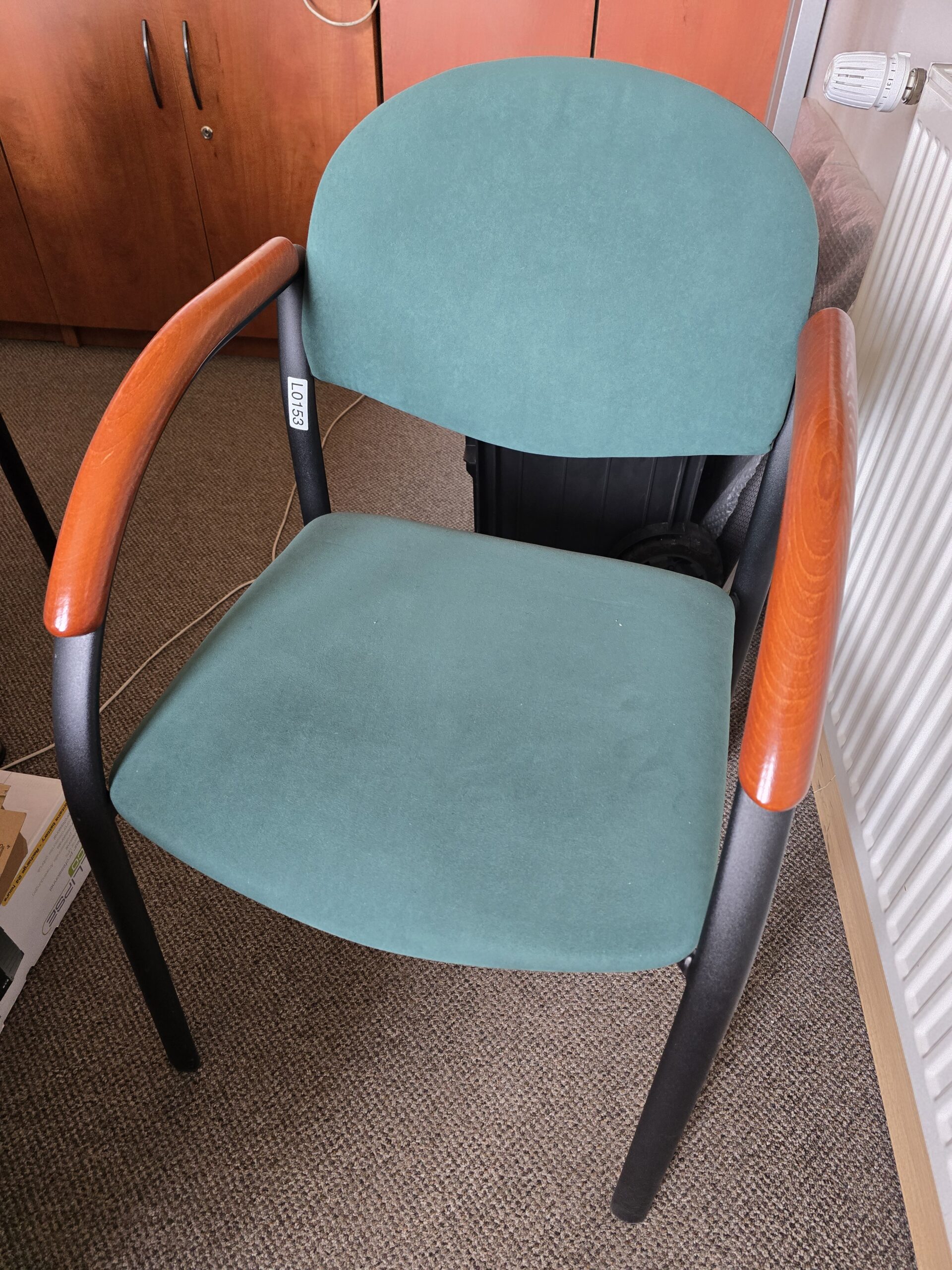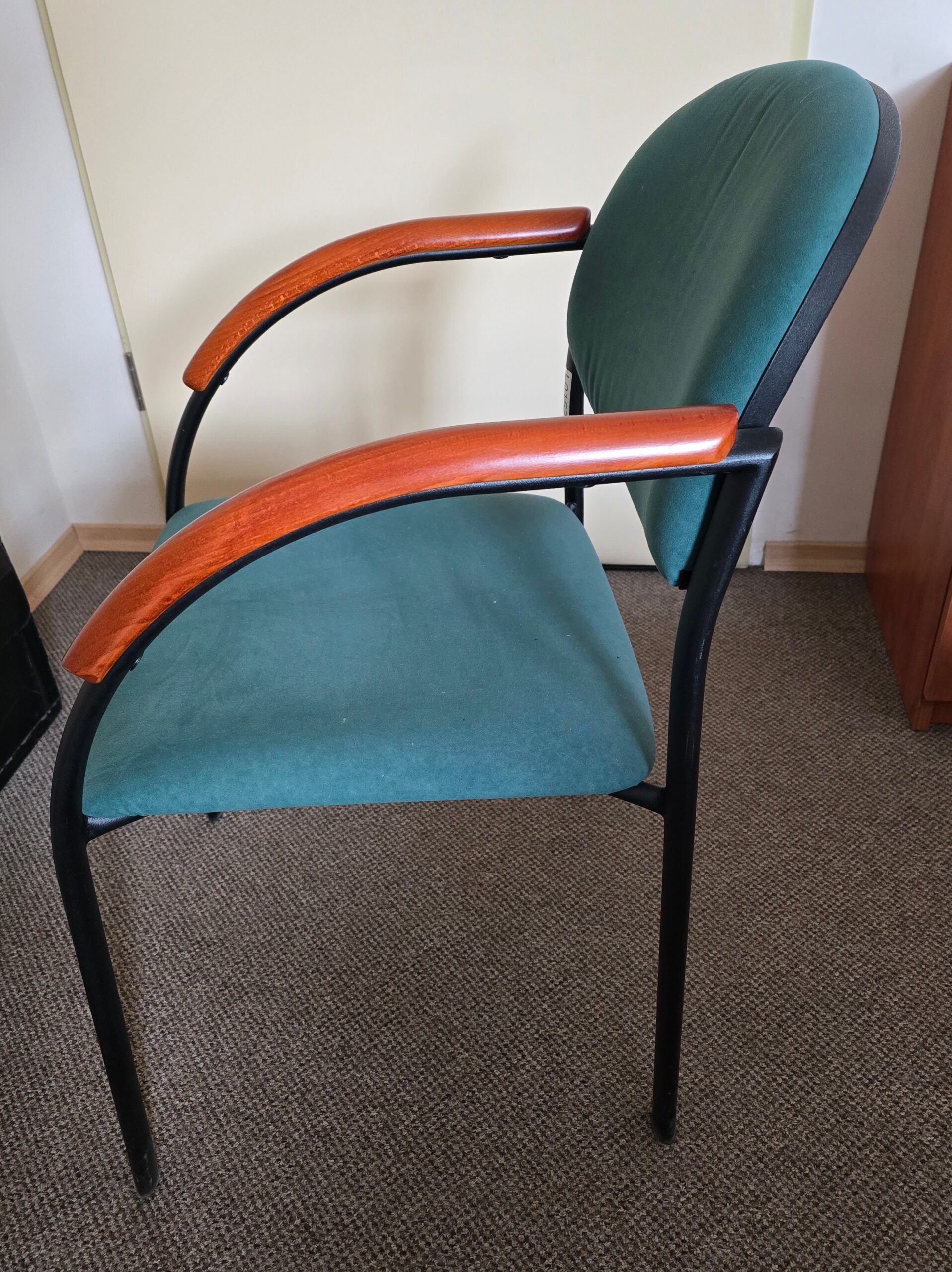 Krzesła biuowe, tapicerowane, z podłokietnikami. Na podłokietnikach okładzina drewniana. Tapicerka w kolorze zielonym. Krzesła idealne do biura, sli konferencyjnej itp. | ||