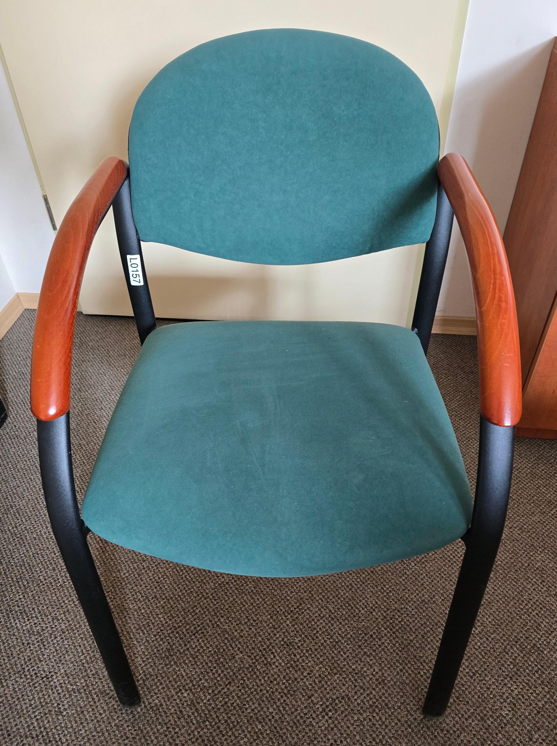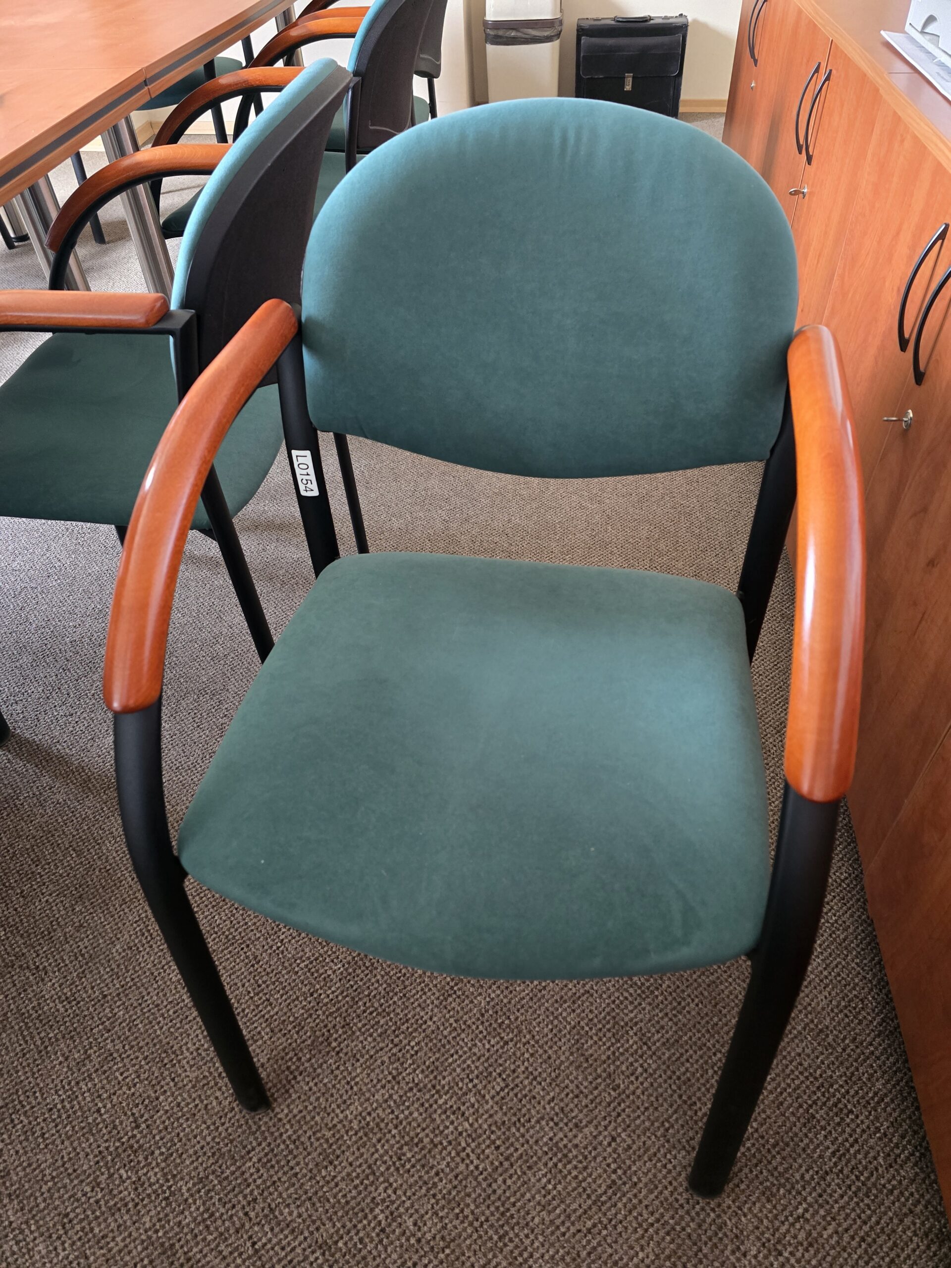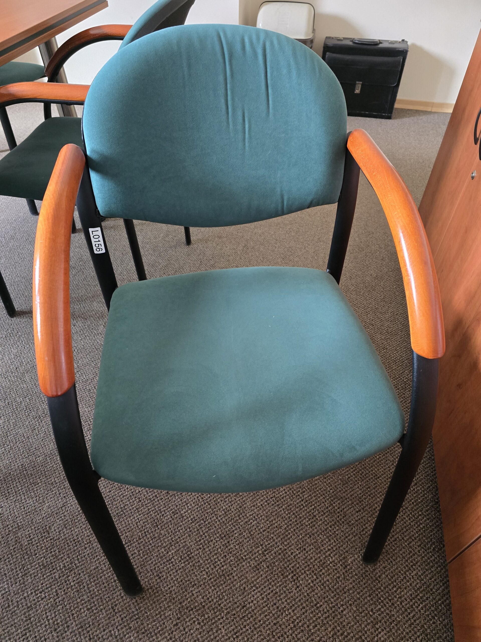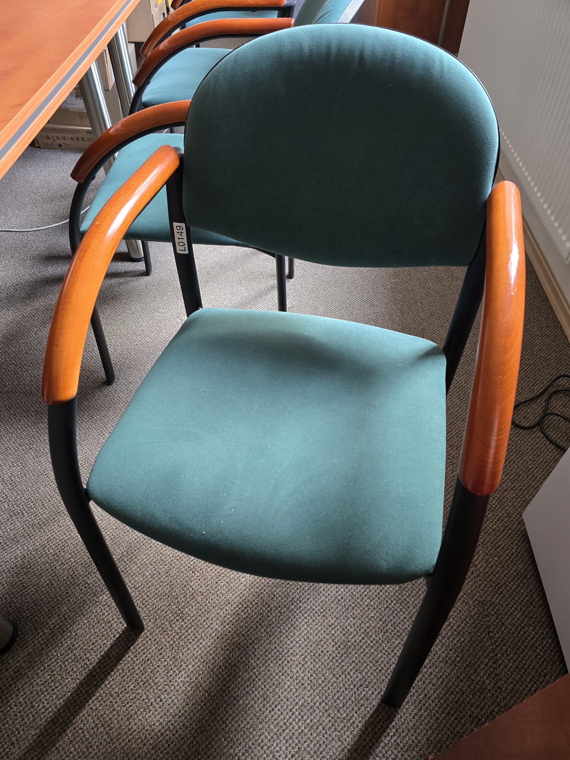 Krzesła biuowe, tapicerowane, z podłokietnikami. Na podłokietnikach okładzina drewniana. Tapicerka w kolorze zielonym. Krzesła idealne do biura, sli konferencyjnej itp. | ||