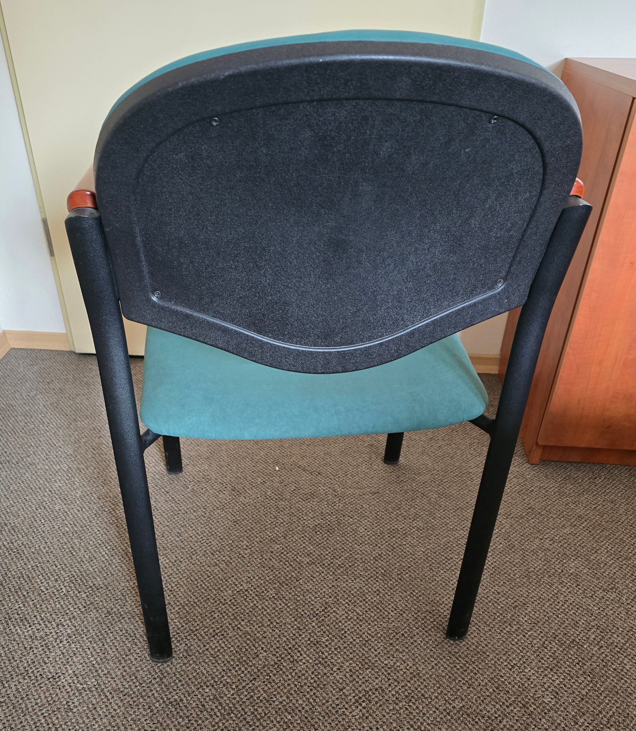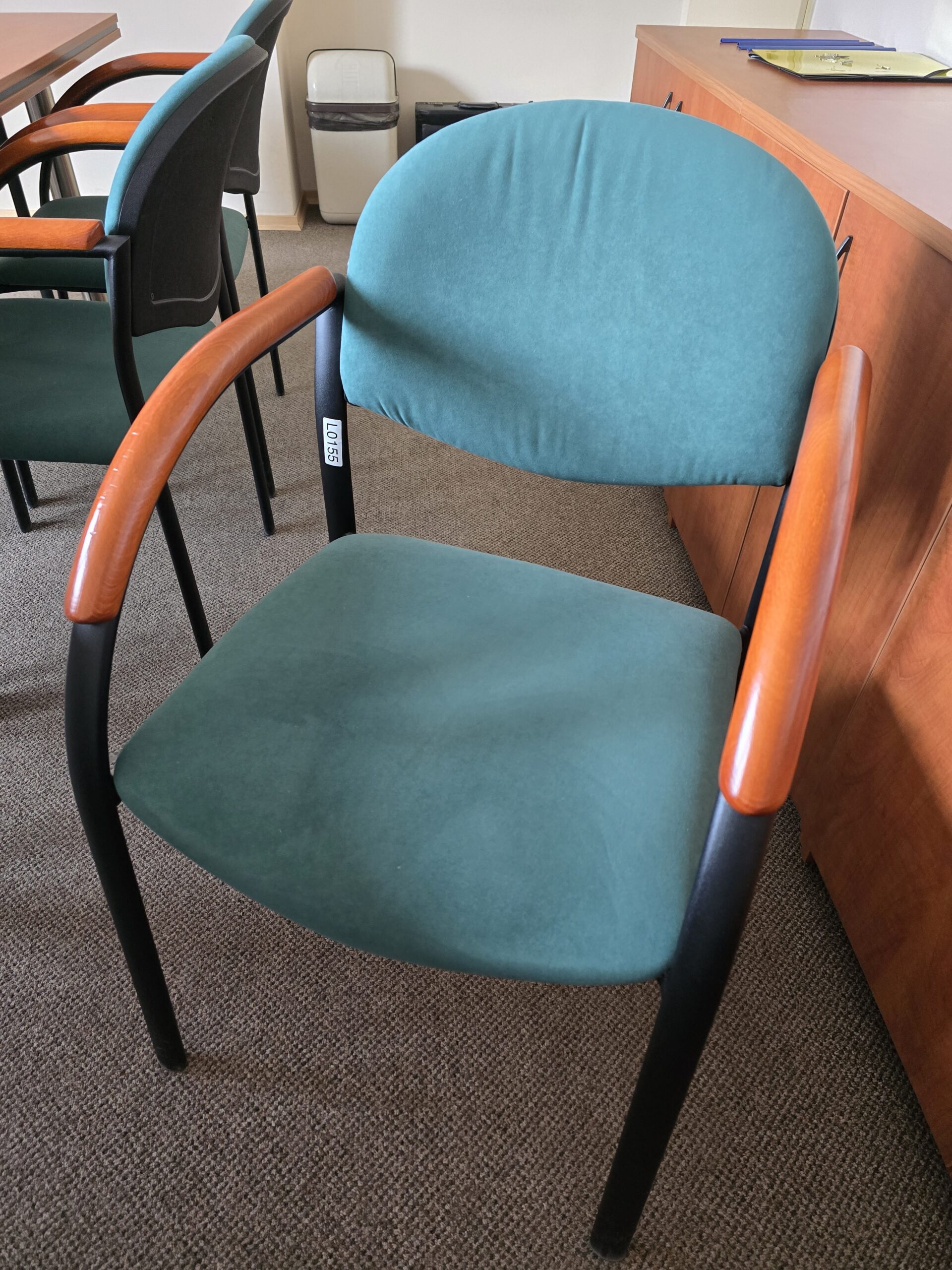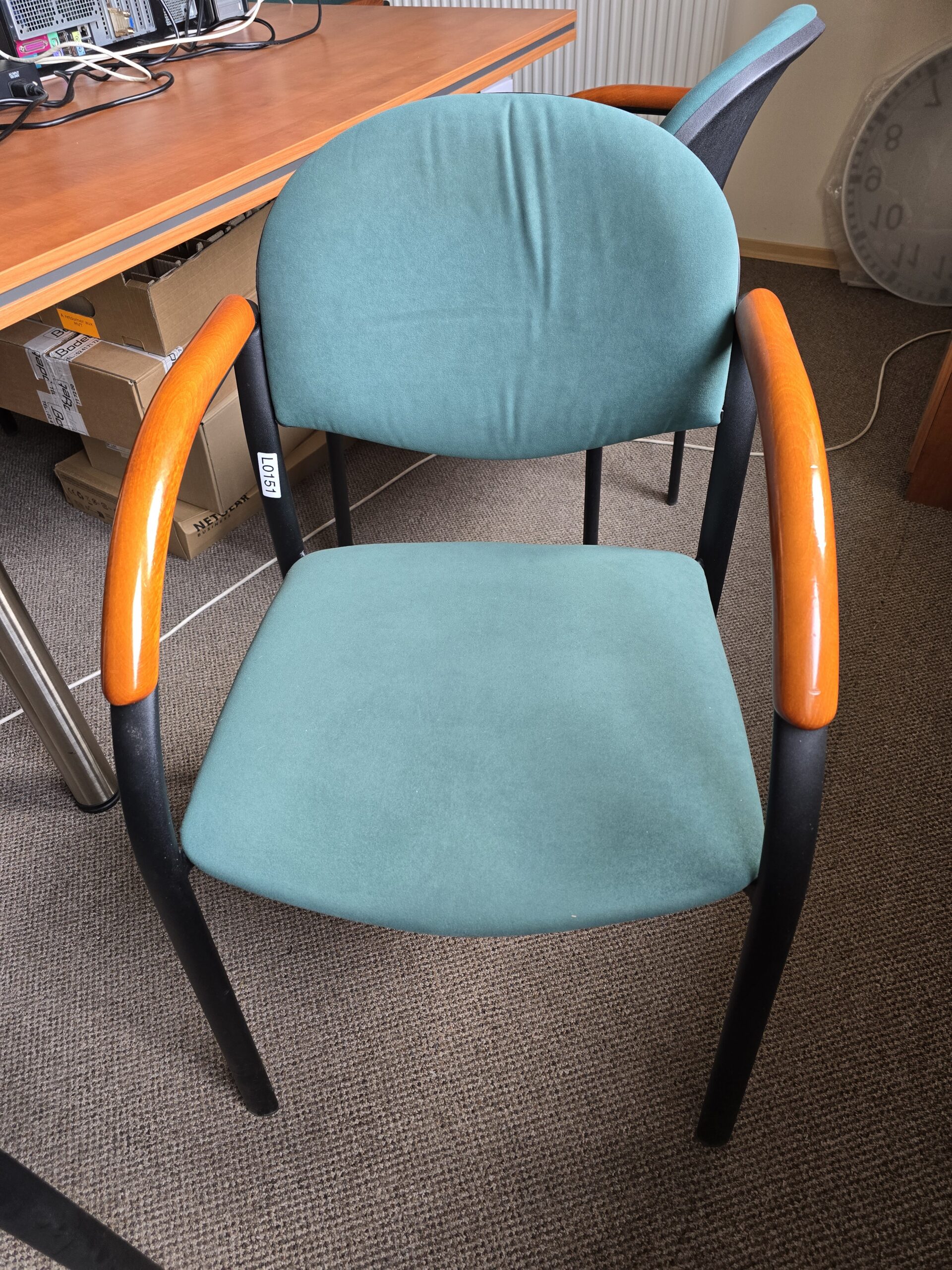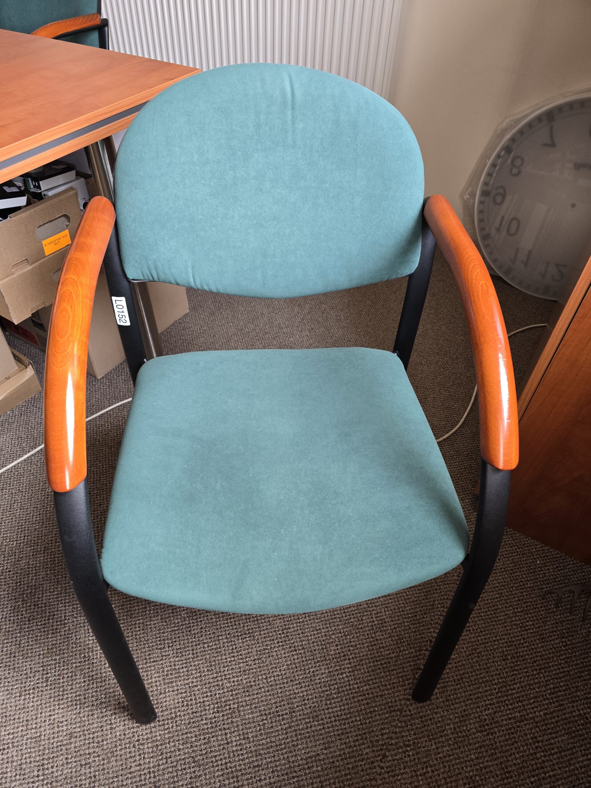 Krzesła biuowe, tapicerowane, z podłokietnikami. Na podłokietnikach okładzina drewniana. Tapicerka w kolorze zielonym. Krzesła idealne do biura, sli konferencyjnej itp. | ||