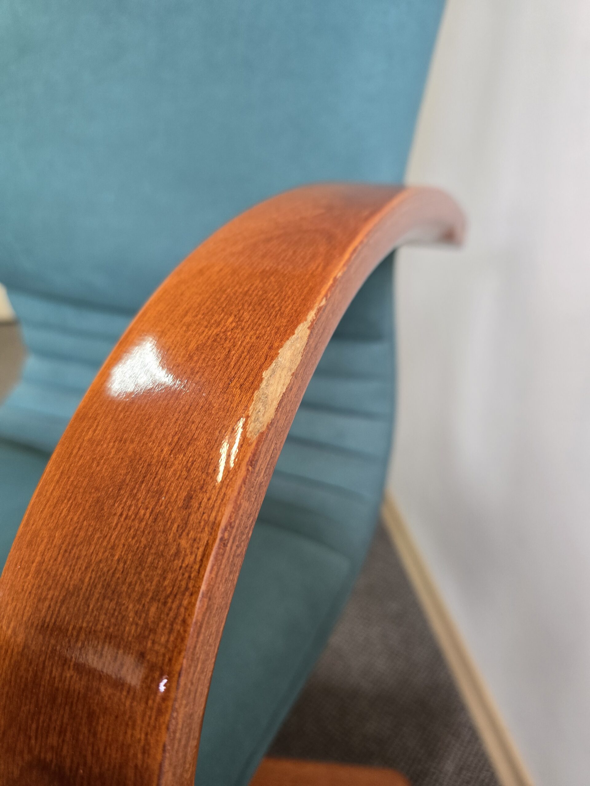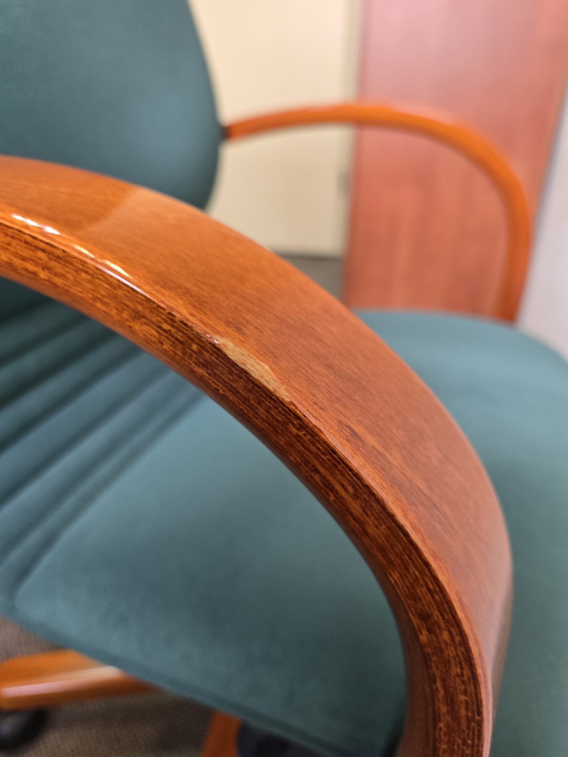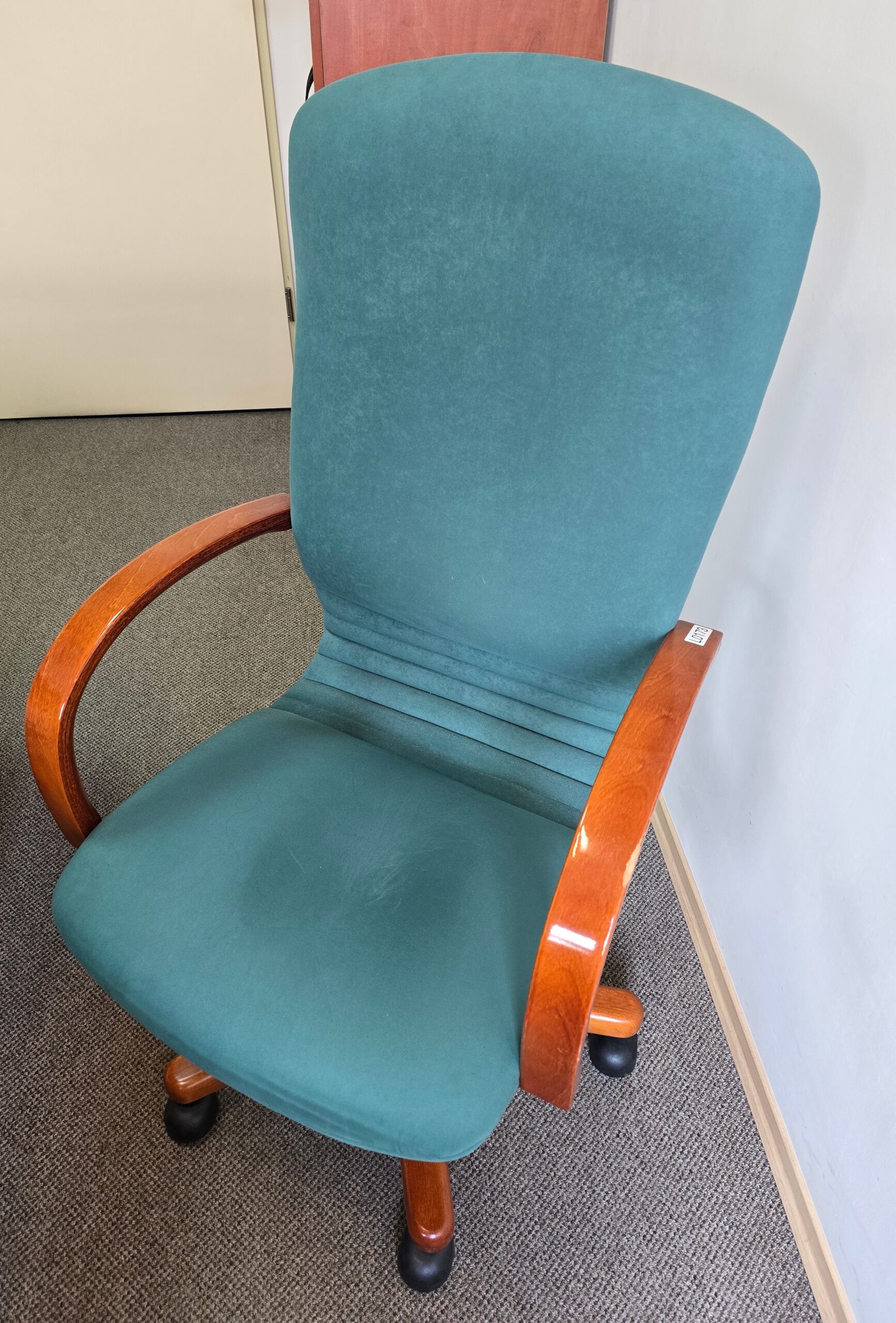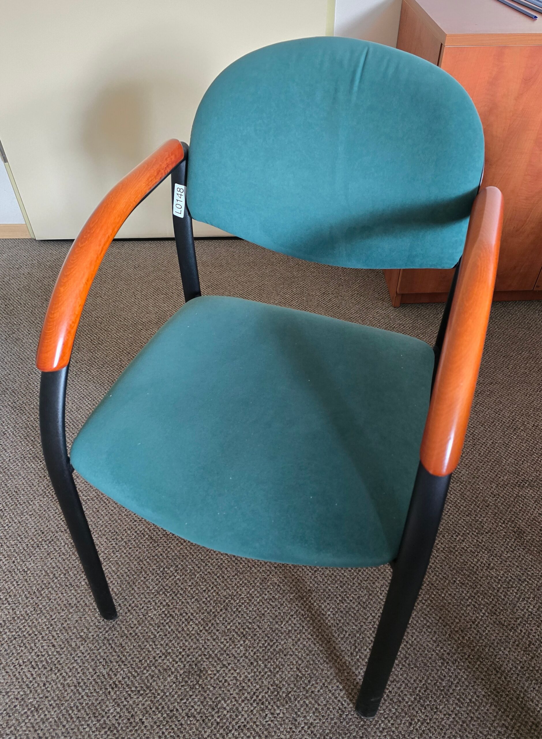 Krzesła biuowe, tapicerowane, z podłokietnikami. Na podłokietnikach okładzina drewniana. Tapicerka w kolorze zielonym. Krzesła idealne do biura, sli konferencyjnej itp. | ||