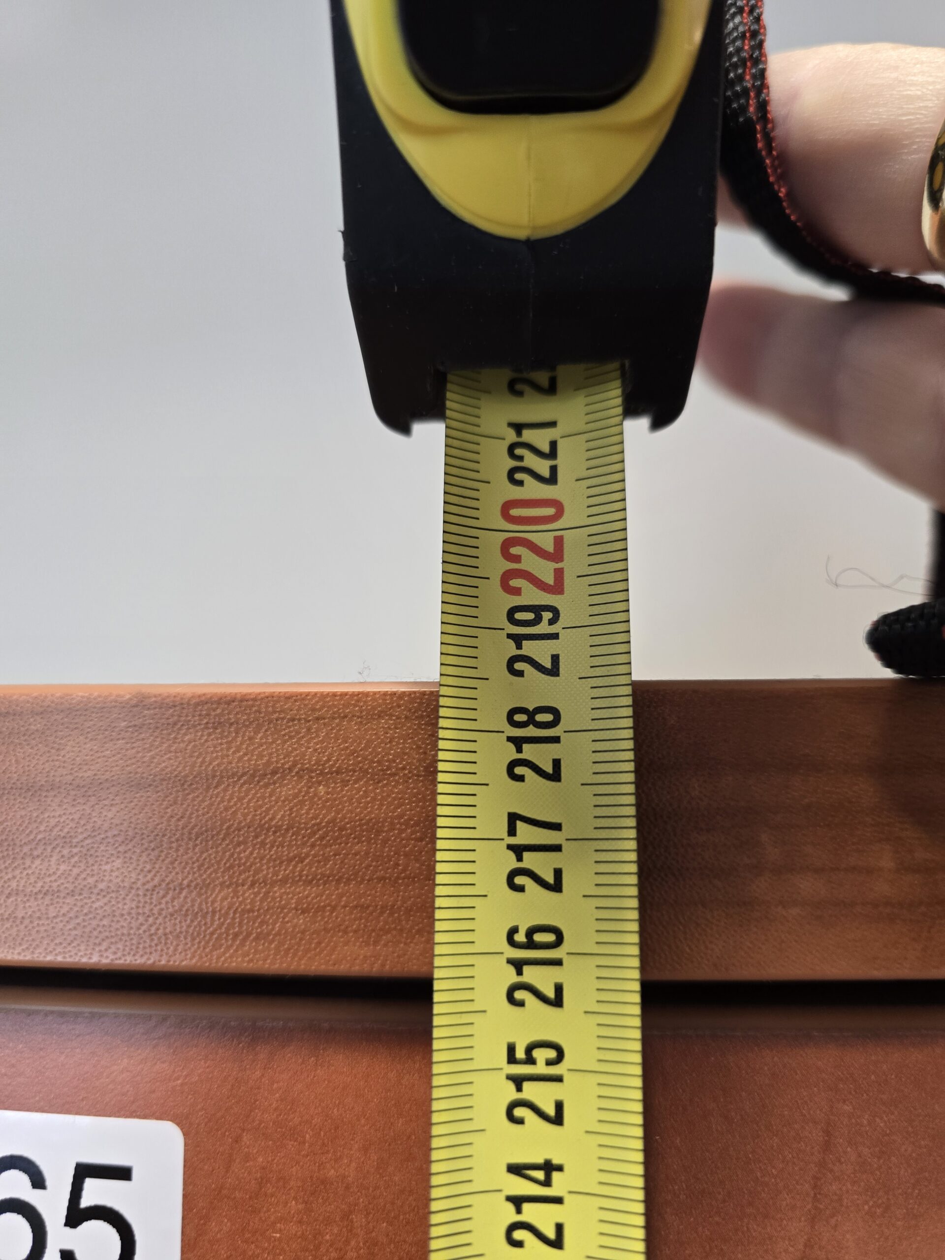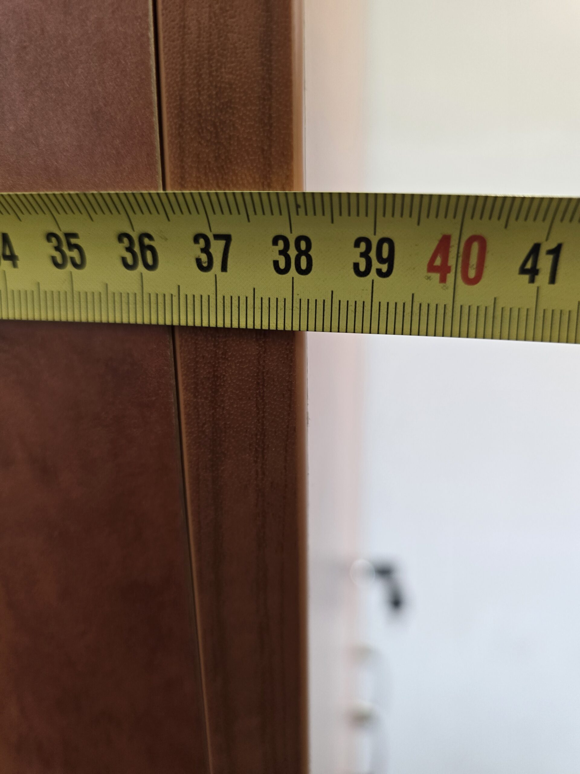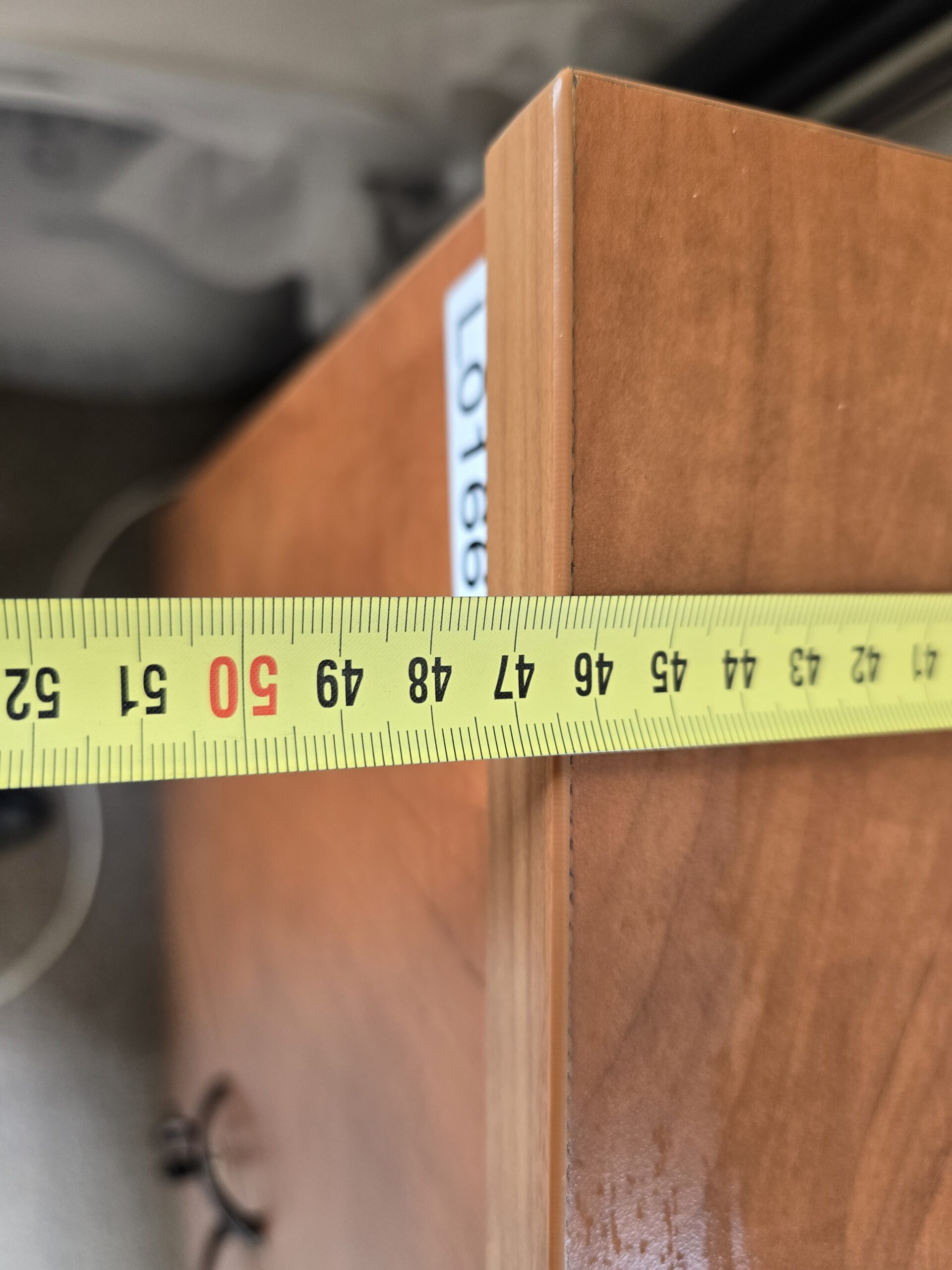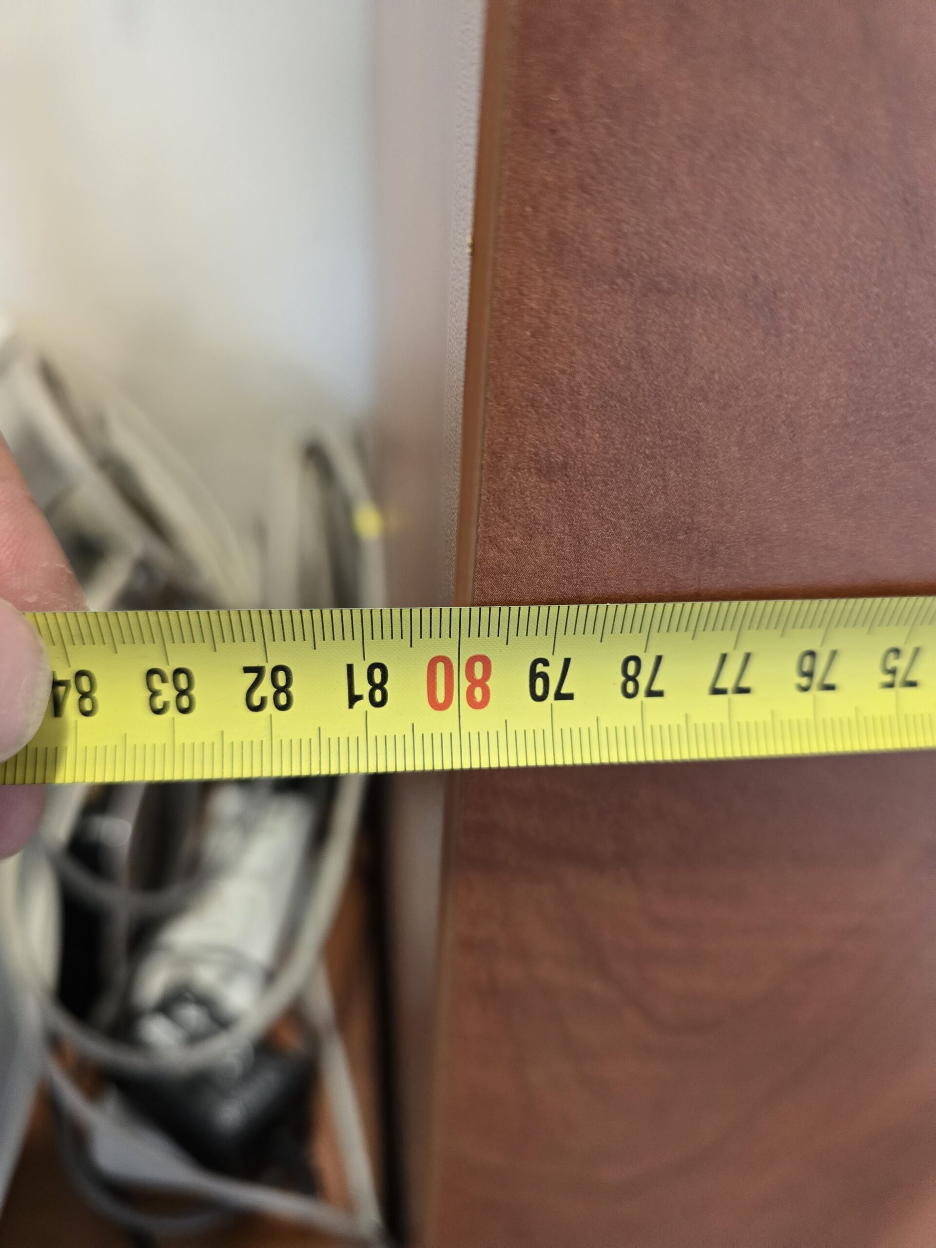 Używana, wysoka szafa biurowa z półkami. Wymiary: 80 x 218,5 x 38 cm (W x S x G). Używana w sali konferencyjnej. W tylnej ścianie szafy wykonane dwa otwory widoczne na zdjęciach. | ||