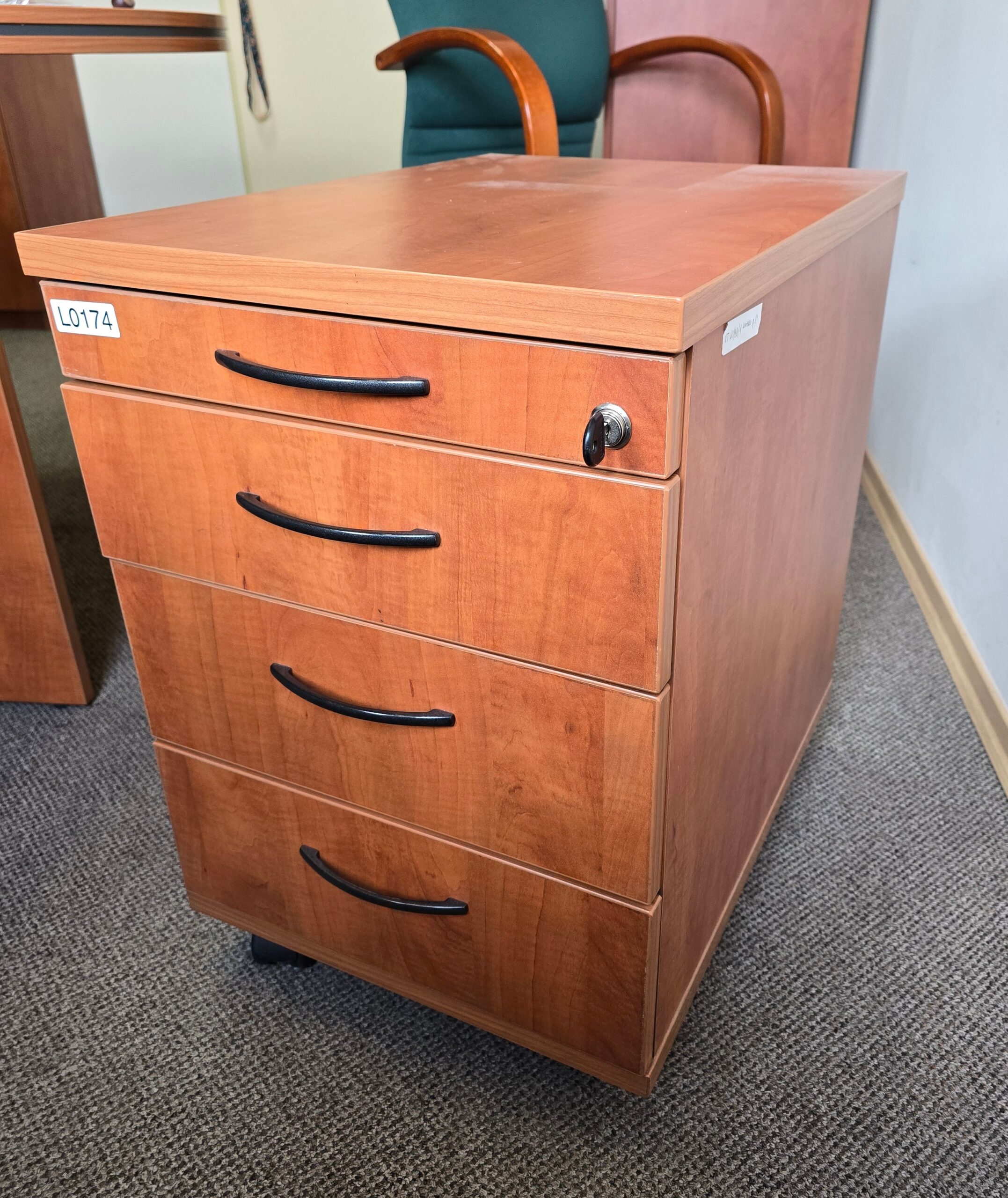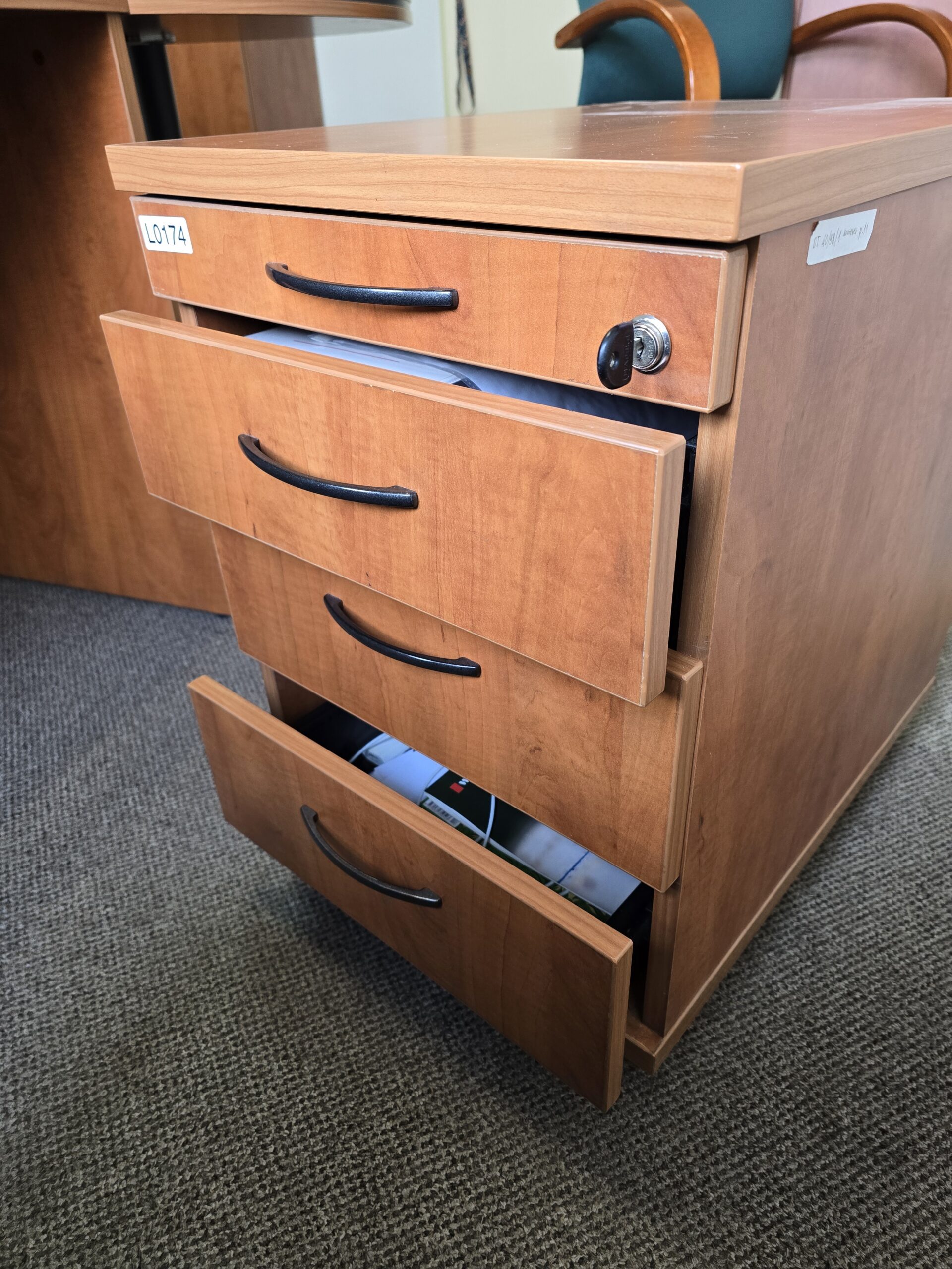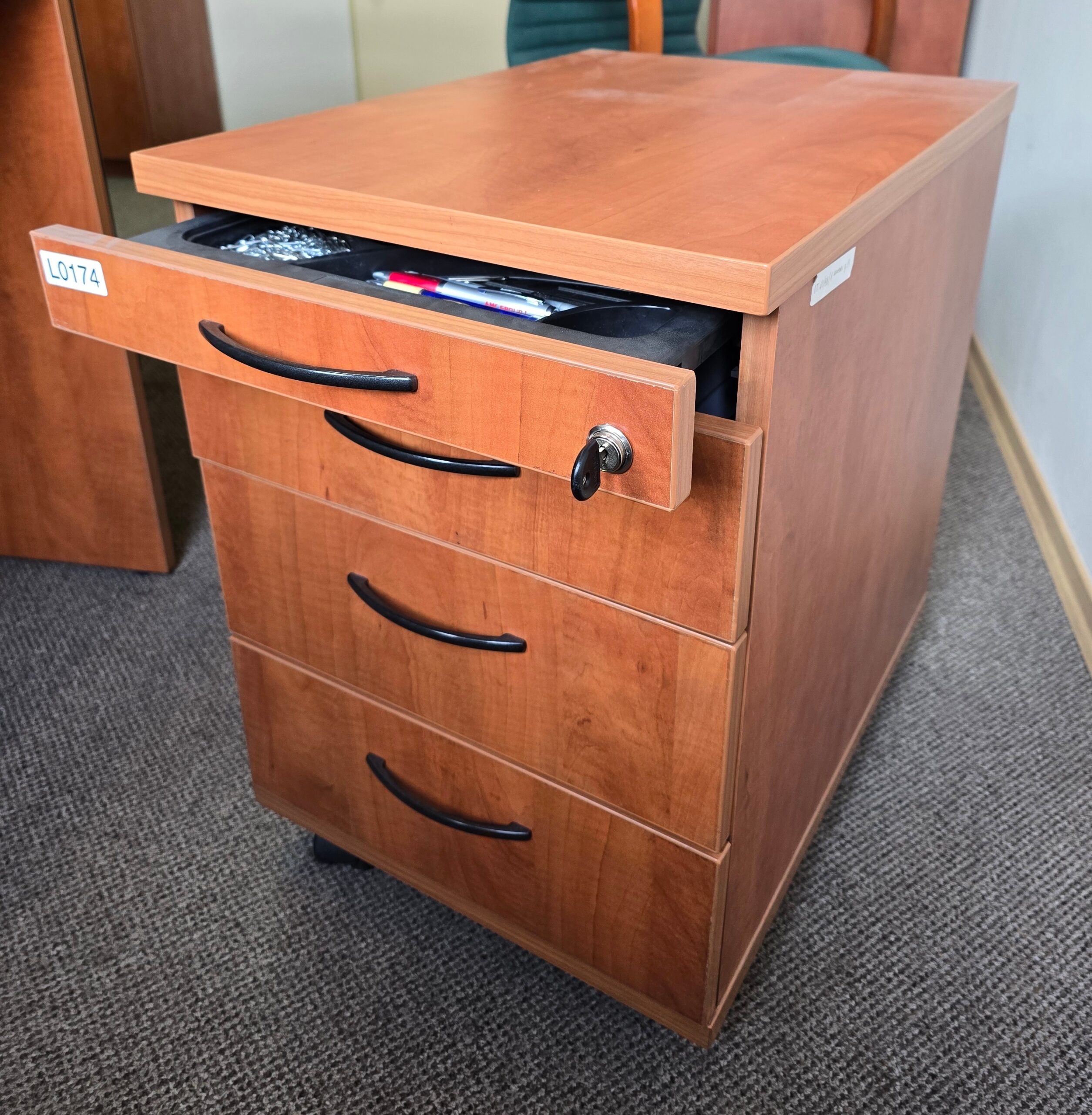 Kontener biurowy pod biurko. Posiada sorter na pisaki (piórnik) w górnej szufladzie, oraz 3 szuflady poniżej. Posiada klucz, ale zamek aktualnie zamyka wyłącznie sorter i środkową szufladę. Kontener na kółkach. | ||
