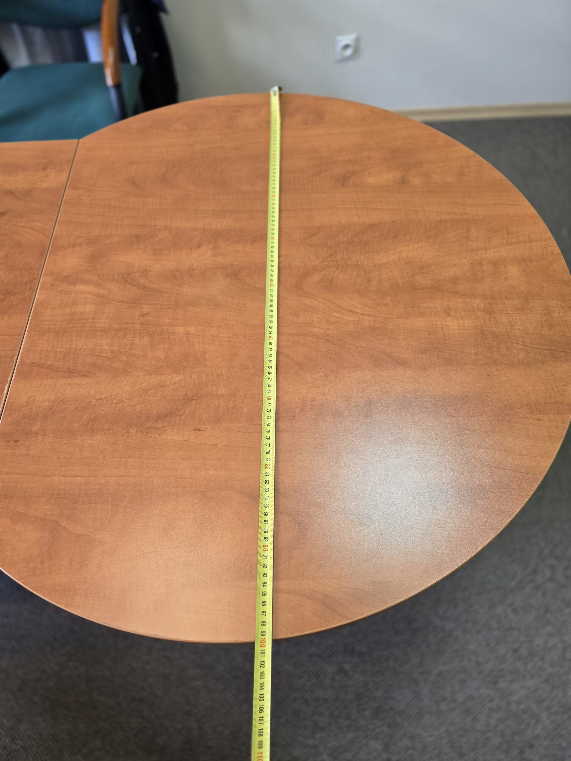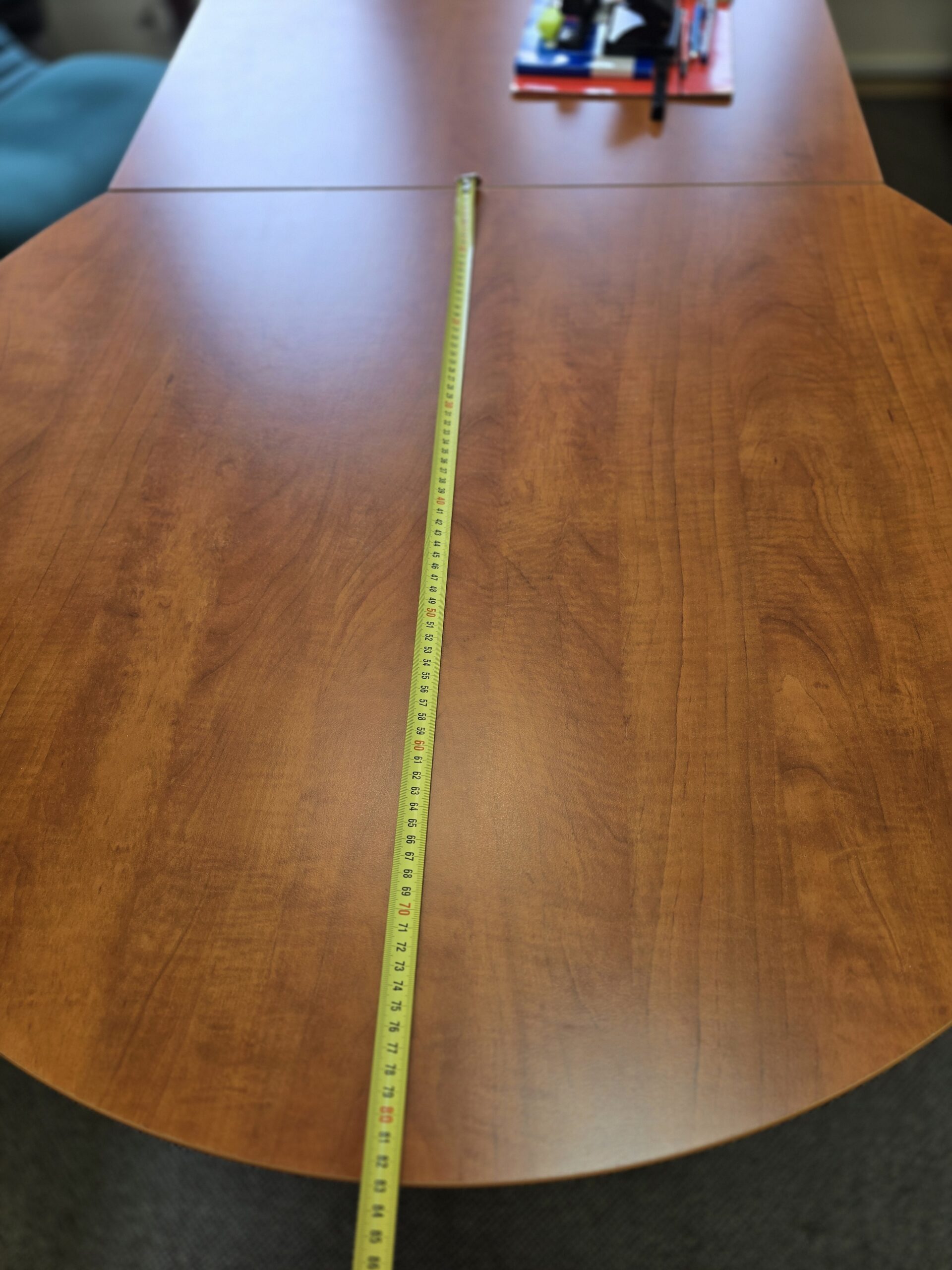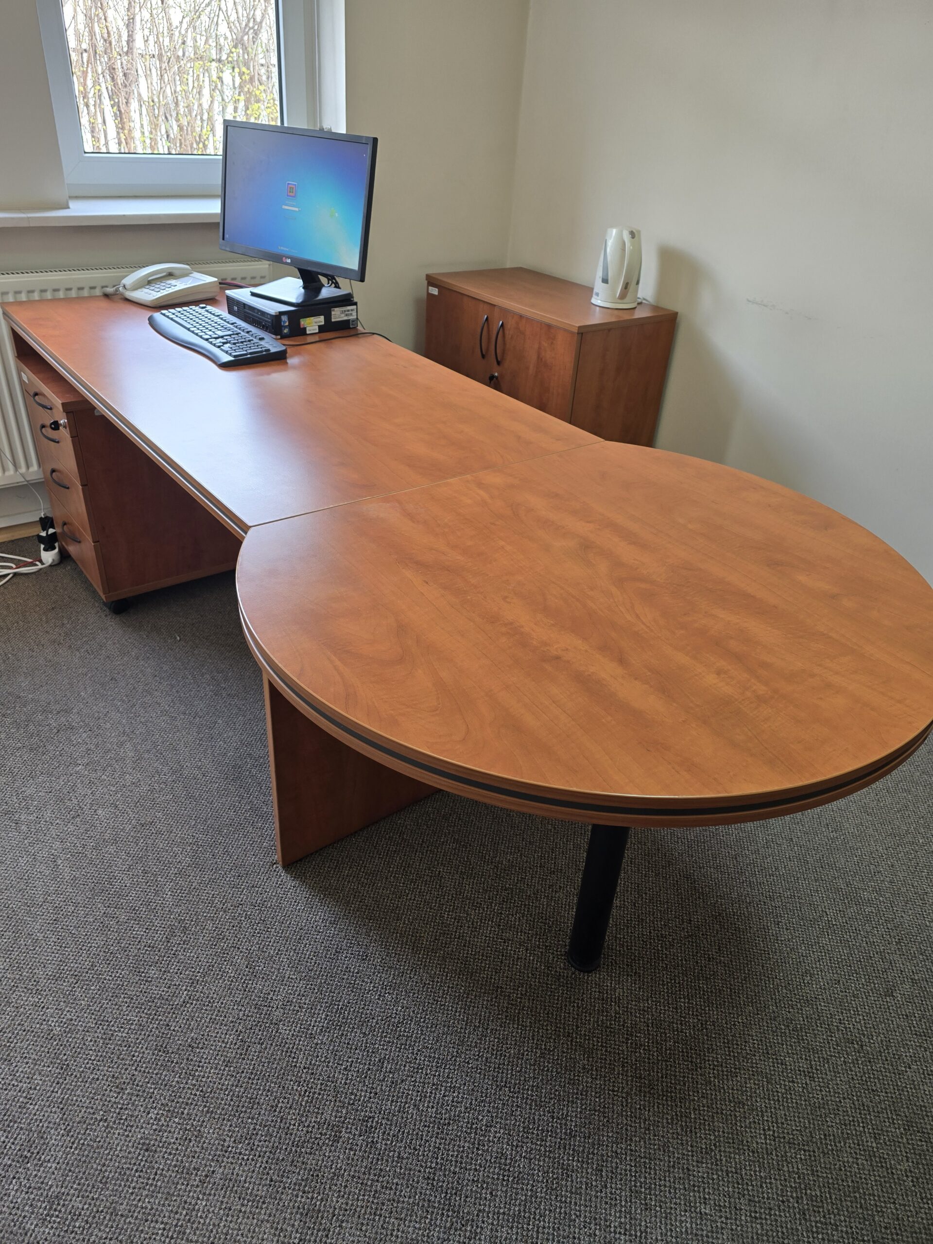 Biurko gabinetowe z okrągłą dostawką. Wymiary biurka: 151,5 x 75,5 cm + dostawka okrągła w postaci ściętego koła o średnicy 100 cm i długości od krawędzi biurka wynoszącej 83 cm. | ||