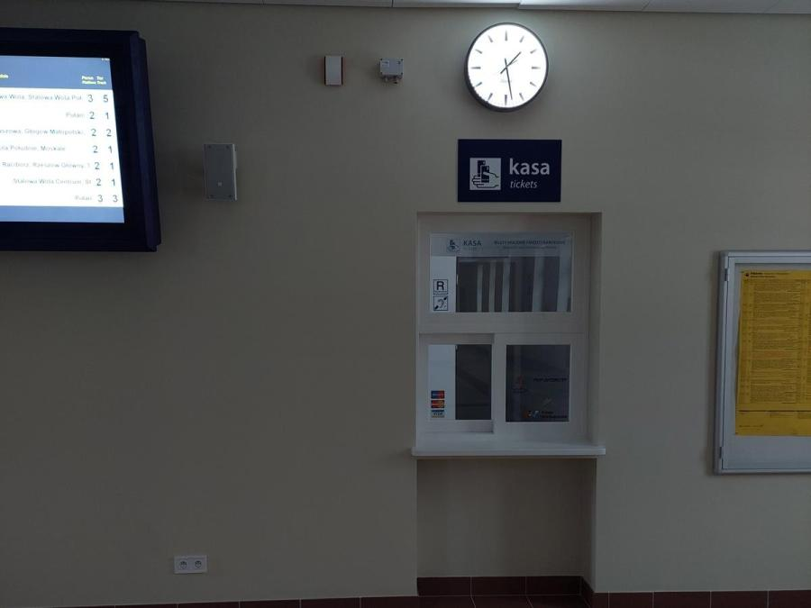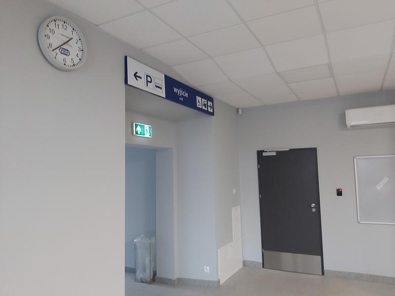 Przykład zegara elewacyjnego o średnicy 140 cm ze świecącymi wskazówkami i podświetlaną tarczą zainstalowanego na dworcu w Goleniowie: